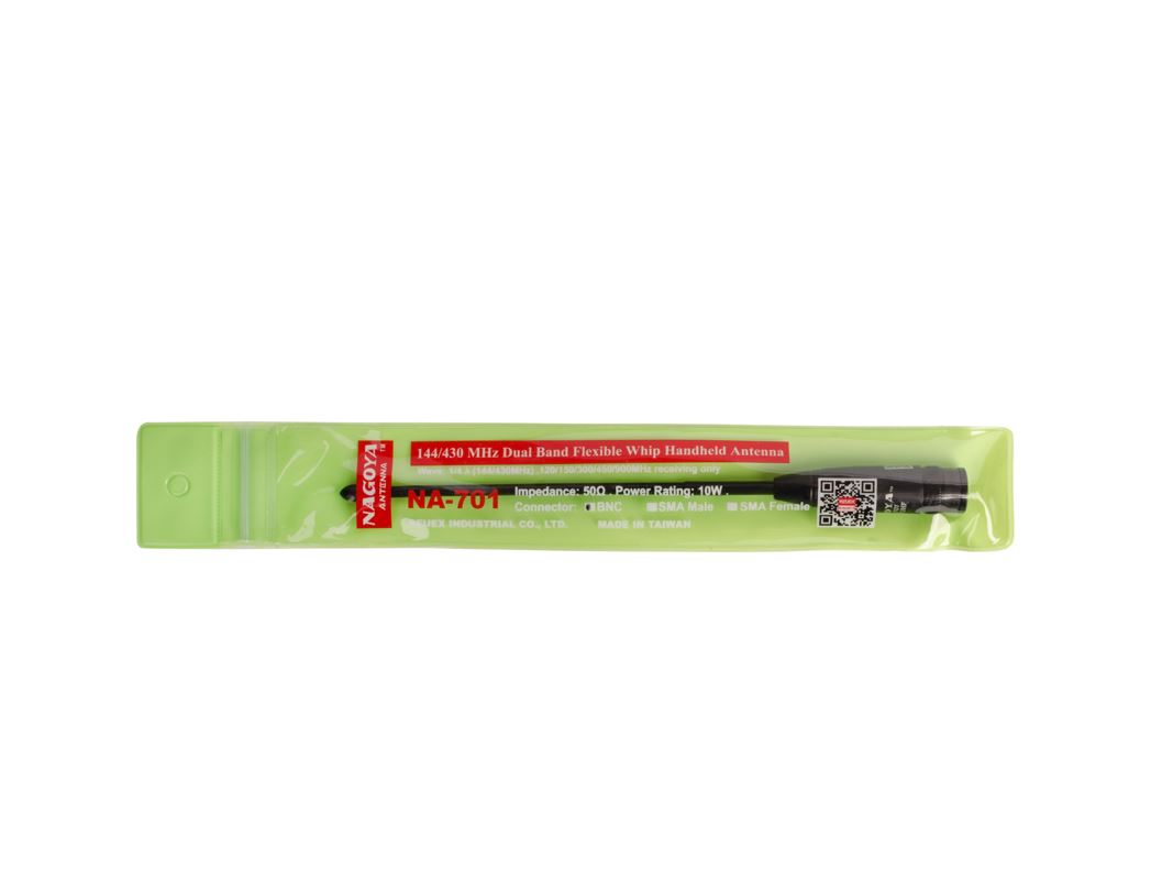 Nagoya NA-701, SMAJ (144/430) — гнучка антена, призначена для посилення сигналу. Завдяки підвищеному коефіцієнту підсилення здатно помітно покращити радіосигнал, щоб ви завжди залишалися на зв'язку. Працює у двох діапазонах UHF/VHF. Сумісна з портативними радіостанціями з BNC Male роз'ємом.